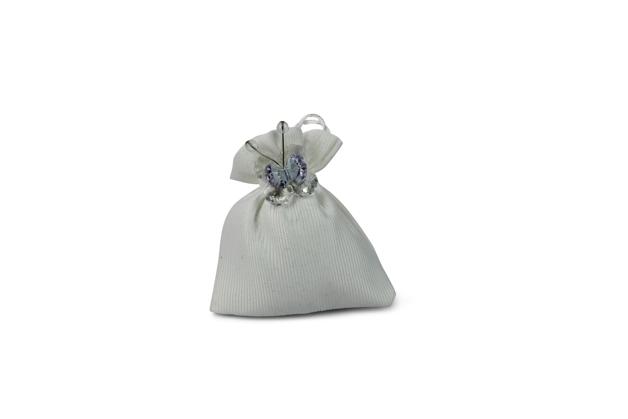 CALAMITE: CALAMITA A FORMA DI FARFALLINA IN CRISTALLO CON OTTAGONI COLOR LILLA AL CENTRO, DISPONIBILI IN DIVERSI COLORI. FORNITO DI SCATOLA E SACCHETTO PORTACONFETTI ENTRAMBI SENZA NASTRINI COLORATI