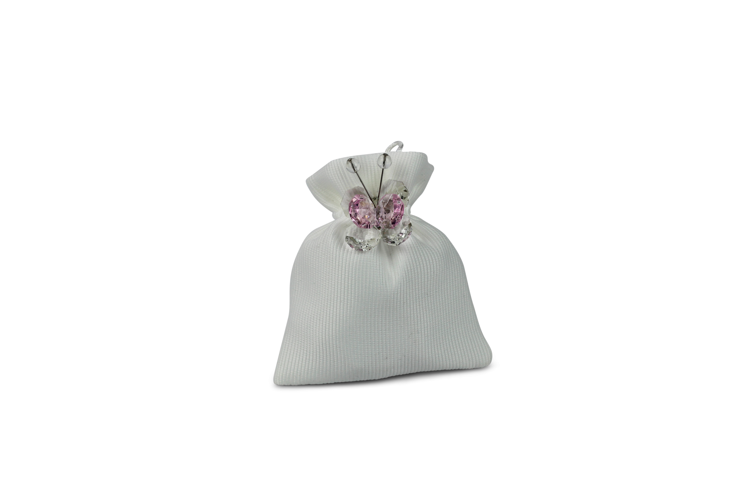 CALAMITE: CALAMITA A FORMA DI FARFALLINA IN CRISTALLO CON OTTAGONI COLOR ROSA AL CENTRO, DISPONIBILI IN DIVERSI COLORI. FORNITO DI SCATOLA E SACCHETTO PORTACONFETTI ENTRAMBI SENZA NASTRINI COLORATI
