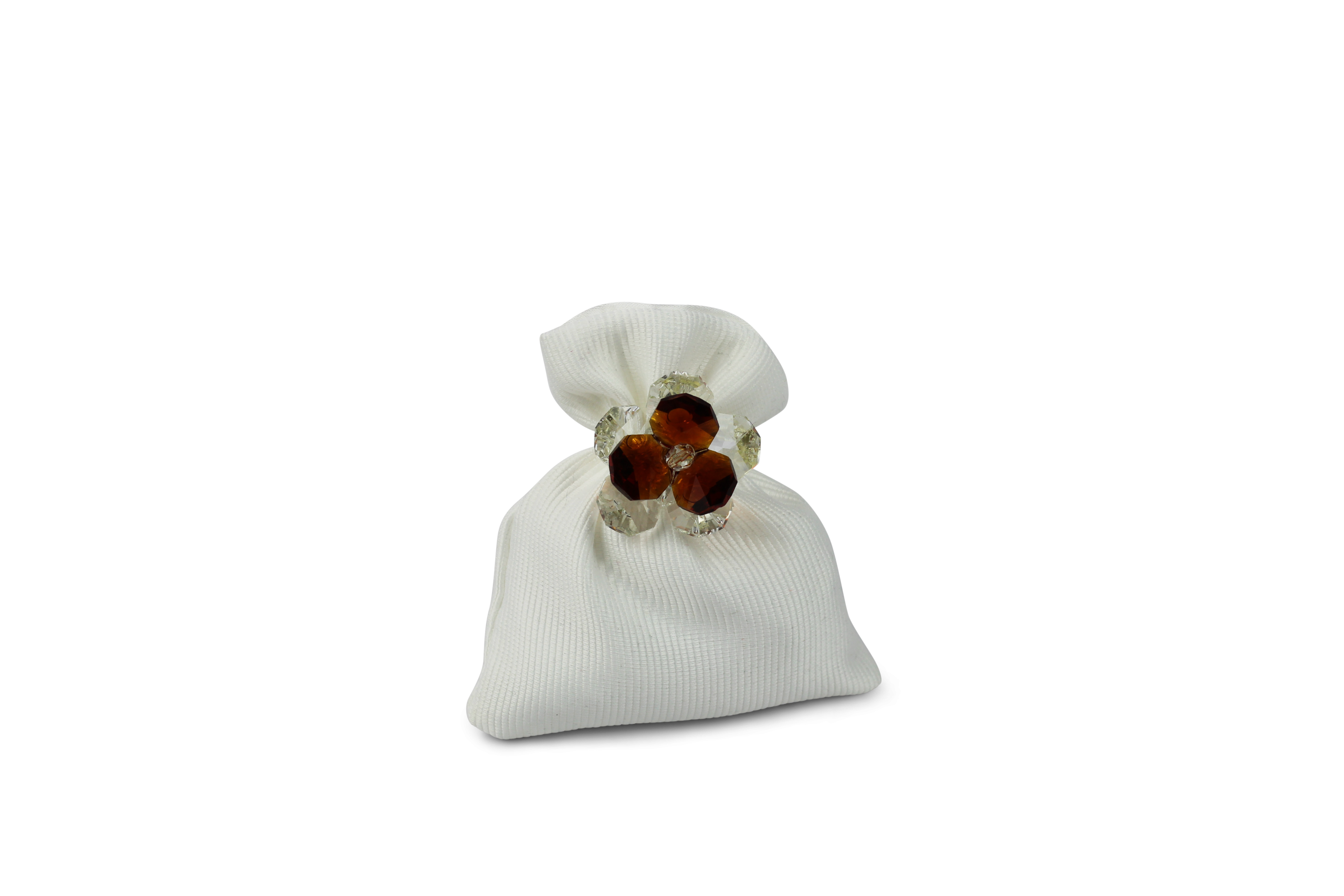 CALAMITE: CALAMITA A FORMA DI FIORE IN CRISTALLO CON OTTAGONI COLOR AMBRA AL CENTRO, DISPONIBILI IN DIVERSI COLORI. FORNITO DI SCATOLA E SACCHETTO PORTACONFETTI ENTRAMBI SENZA NASTRINI COLORATI